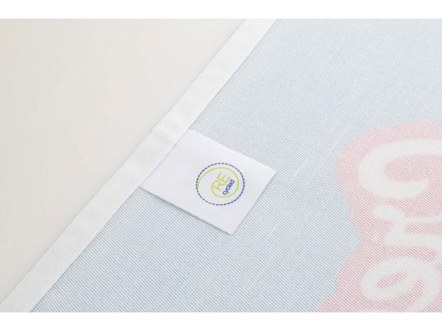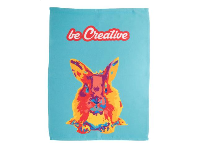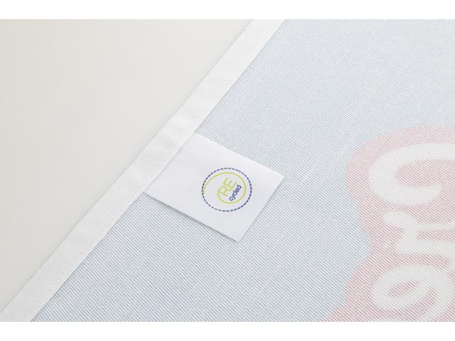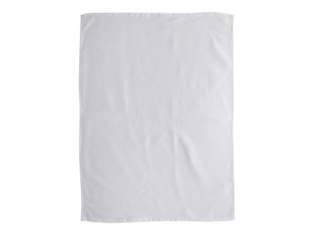 Woven twill kitchen towel with hanger and sublimation printed graphics on front side. 30% RPET and 70% cotton, 280 g/m². Price includes sublimation printing. MOQ: 25 pcs.
