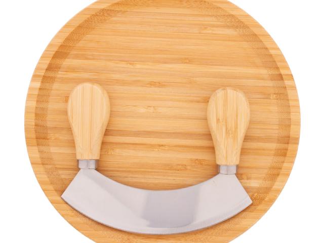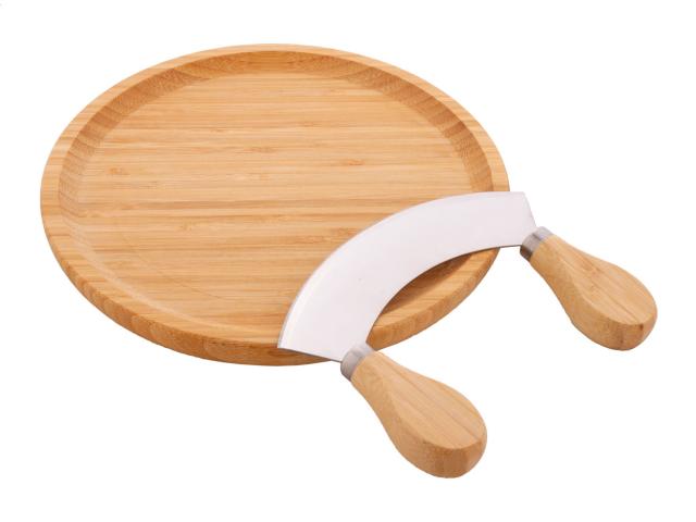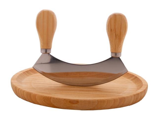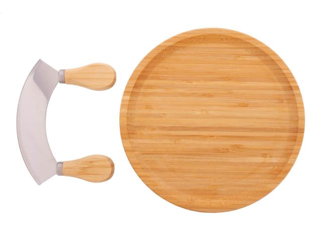Bamboo herb cutting set, including a round bamboo cutting board and stainless steel herb cutter with bamboo handles.