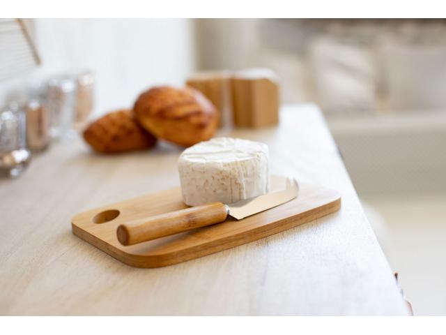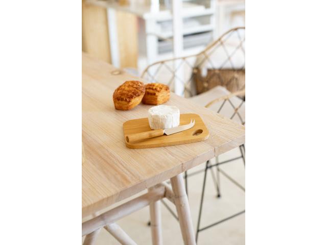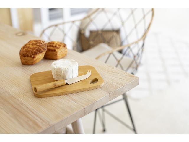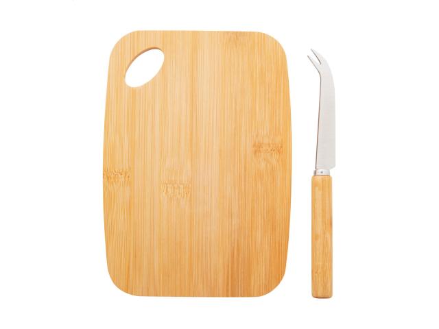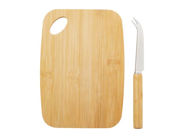 Bamboo cheese set with stainless steel knife and bamboo cutting board. In kraft paper box.
