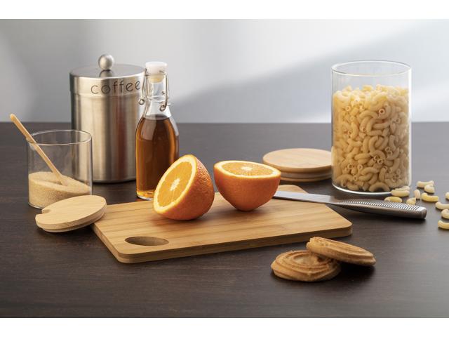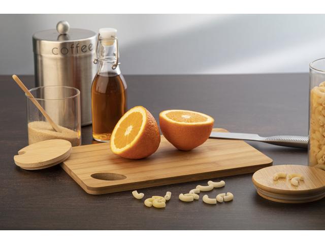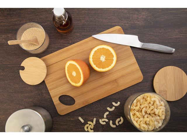 Bamboo cutting board with die-cut hole.