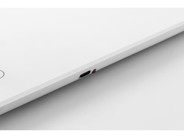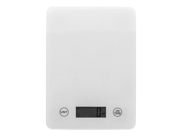 Digital kitchen scale with tempered glass weighing platform and built-in USB rechargeable battery (200 mAh). Capacity: 5 kg, graduation 1 g, measurement units: g/oz. With water/milk ml indicator. Including USB charger cable.