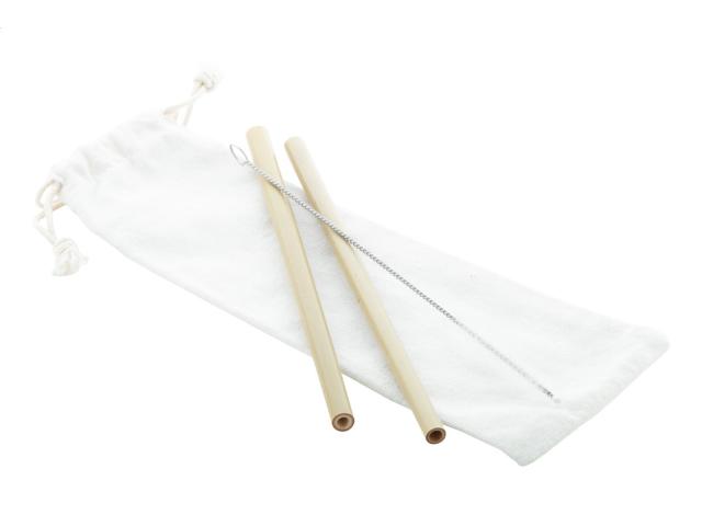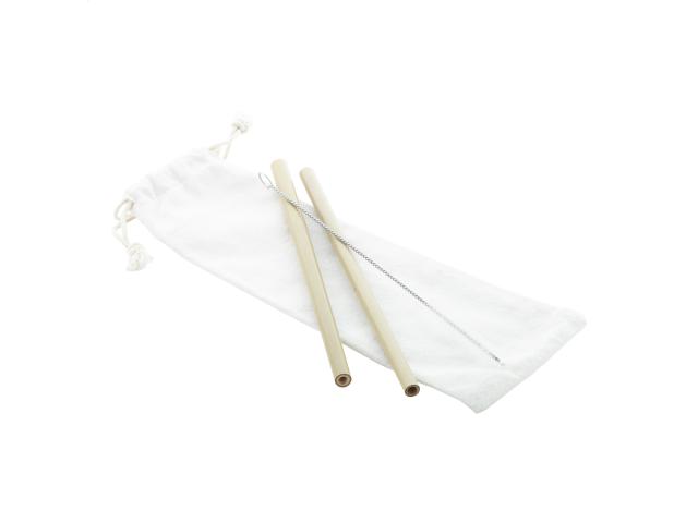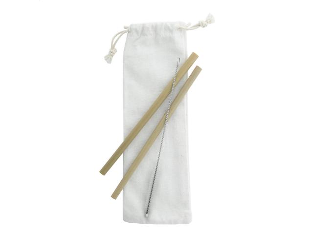 Set of 2 reusable natural bamboo drinking straws and cleaning brush in cotton pouch. The diameter and surface of the straws may vary.