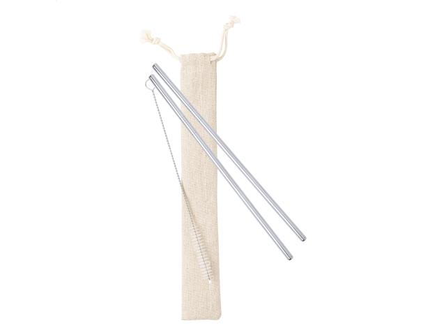 Set of 2 reusable stainless steel drinking straws and cleaning brush in cotton pouch.