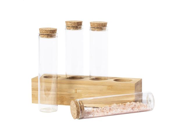 4 pc borosilicate glass spice holder set with natural cork lids and bamboo stand, 70 ml.