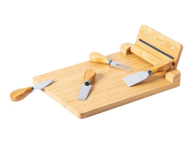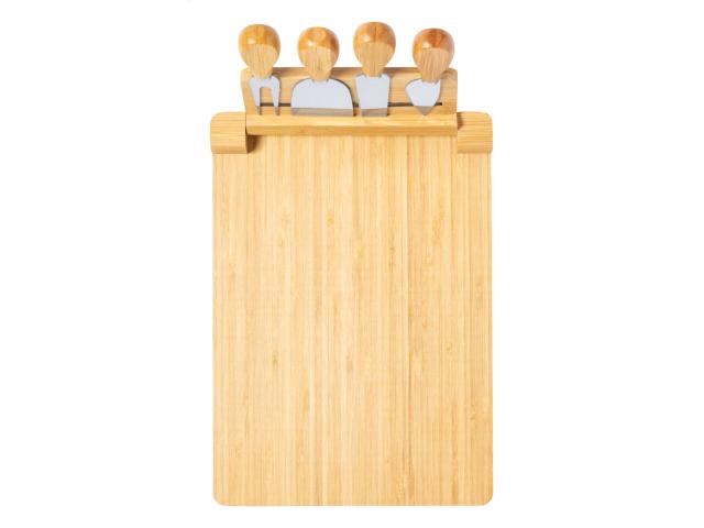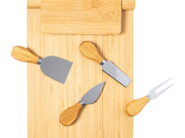 Bamboo cutting board with 4 pc stainless steel cheese knife set on foldable magnetic holder.