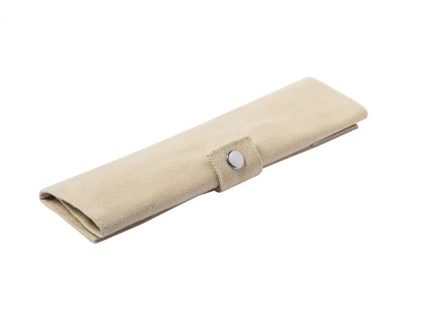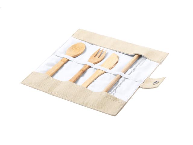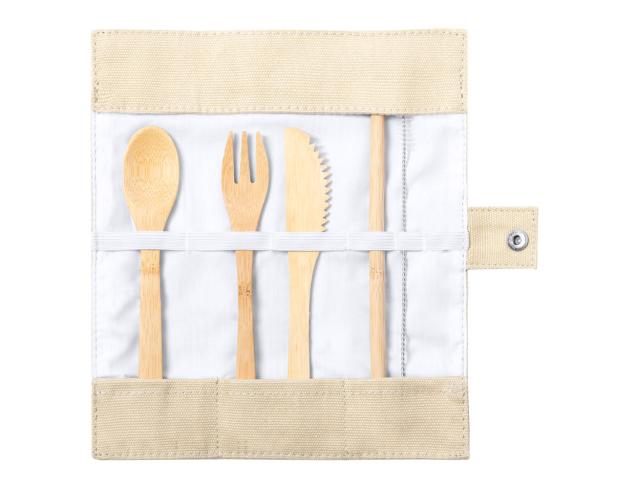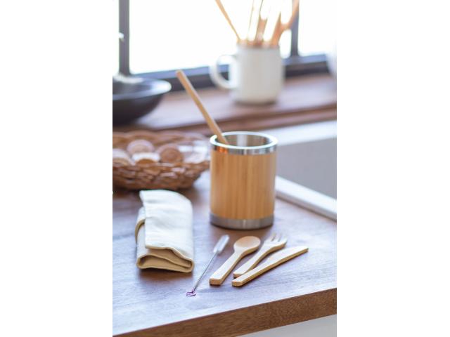 5 pc bamboo cutlery set in cotton pouch. Including fork, knife, spoon, drinking straw and cleaning brush.