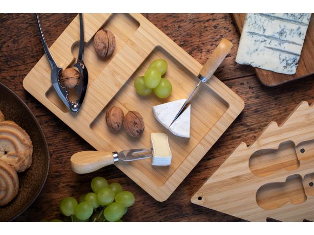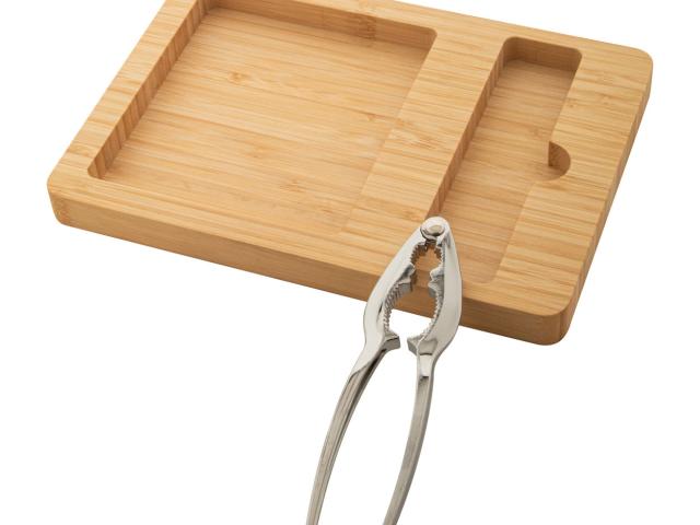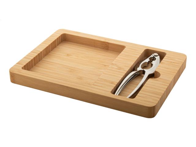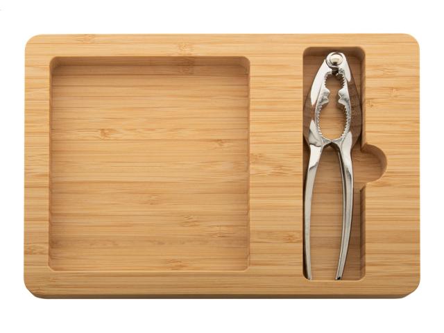 Nutcracker set with bamboo tray and metal nutcracker. In kraft paper box.