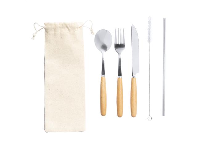 5 pc stainless steel cutlery set with wooden handle, in cotton drawstring pouch. Including fork, knife, spoon, drinking straw and cleaning brush.