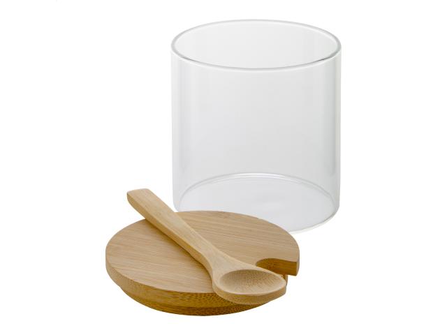 Borosilicate glass spice holder jar with bamboo lid and spoon, 300 ml. Ideal to store sugar, spices or nuts.
