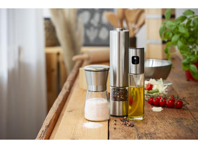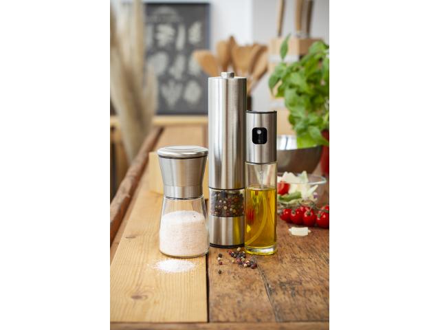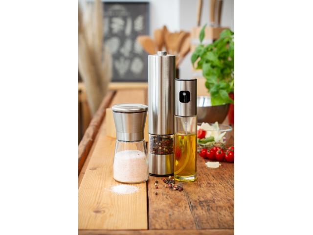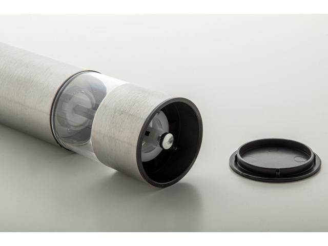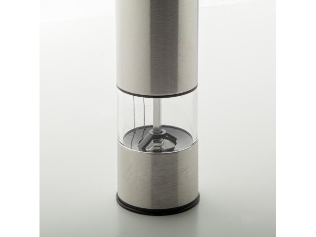 Stainless steel electric salt and pepper mill with ceramic grinder core and LED light. Operates with 4 AA batteries, without batteries.