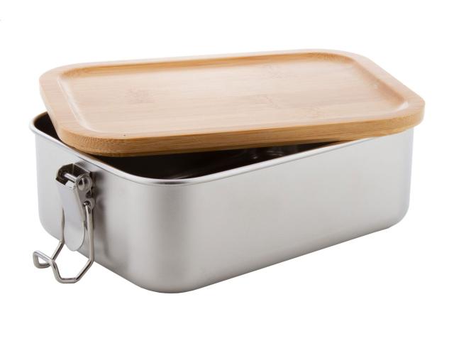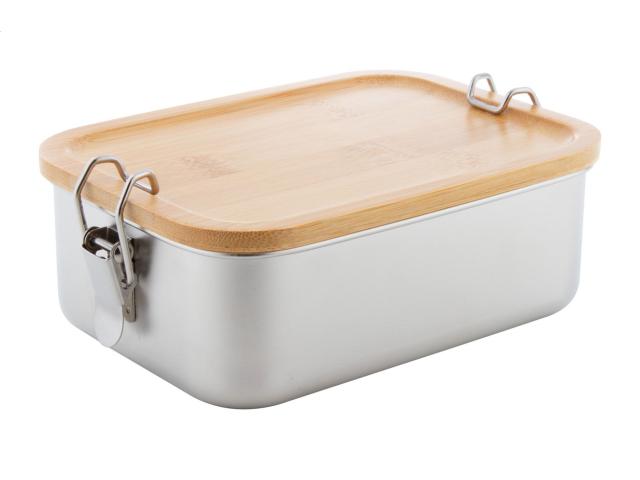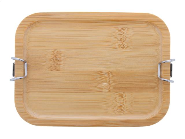 Stainless steel lunch box with bamboo lid and secure buckle closure, 750 ml.