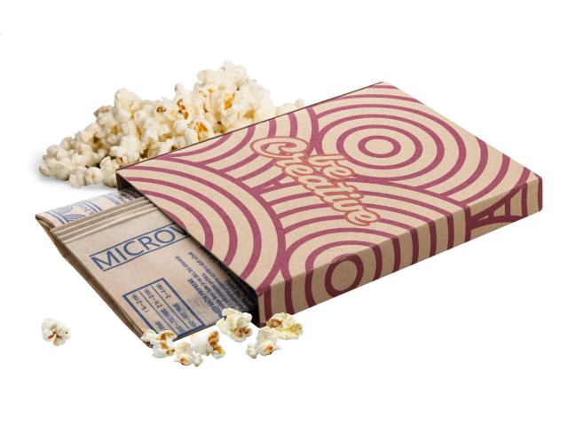 One bag of salted microwave popcorn (100 grams) in custom made, full colour printed kraft paper sleeve. MOQ: 100 pcs.
