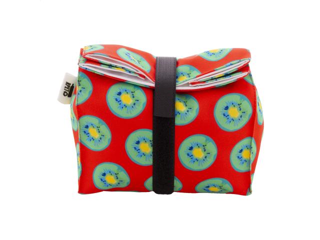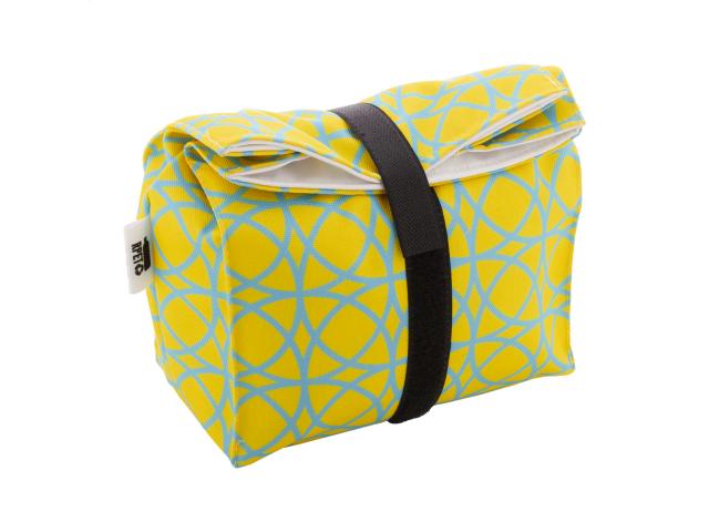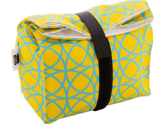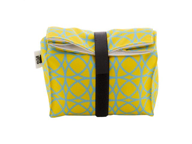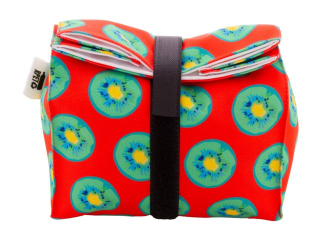 Custom made, reusable rolltop snack bag in 600D RPET polyester with durable waterproof lining and velcro closure. Ideal for wrapping snacks or a sandwich. With all over sublimation printed graphics. MOQ: 25 pcs.