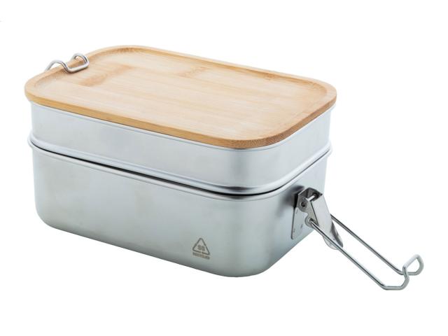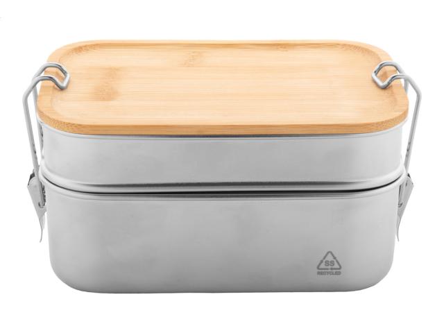 Recycled stainless steel lunch box with bamboo lid and secure buckle closure. With 2 compartments of 340 and 600 ml capacity.