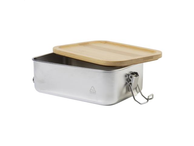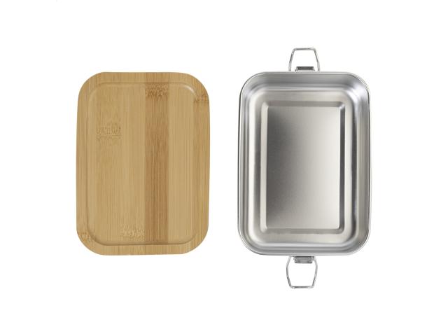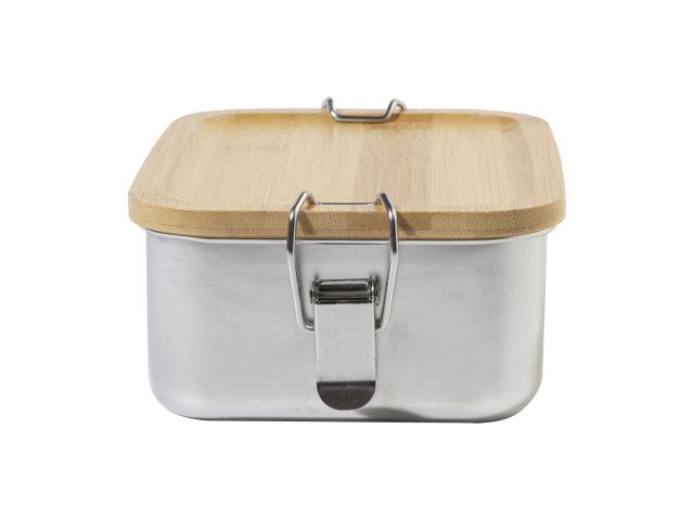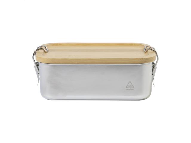 Recycled stainless steel lunch box with bamboo lid and secure buckle closure, 750 ml.