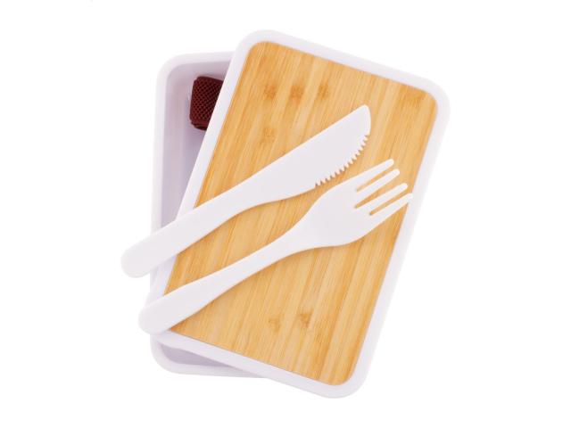 Recycled PP plastic lunch box with bamboo lid, cutlery set (knife and fork) and elastic strap. 500 ml.