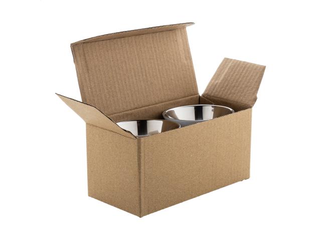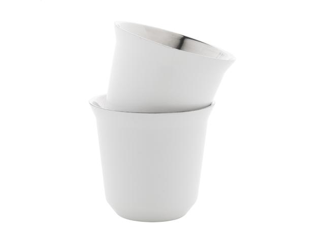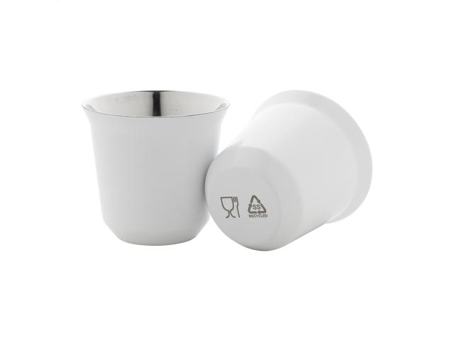 2 pc espresso cup set with coffee capsule shaped double-wall insulated thermo cups in recycled stainless steel, 80 ml. In kraft paper box.