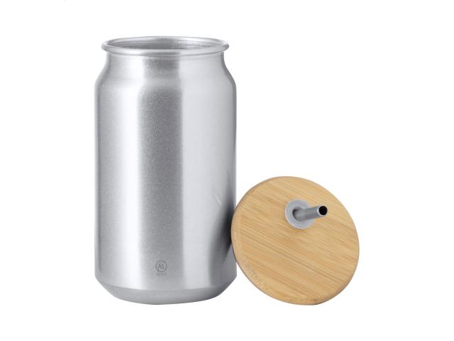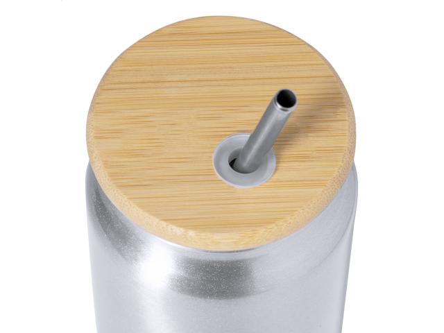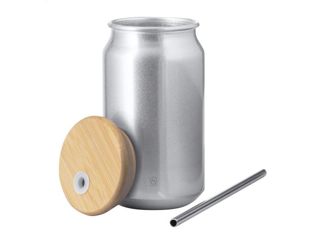 Recycled aluminium mason jar cup with bamboo lid and stainless steel drinking straw, 430 ml. In kraft paper box.