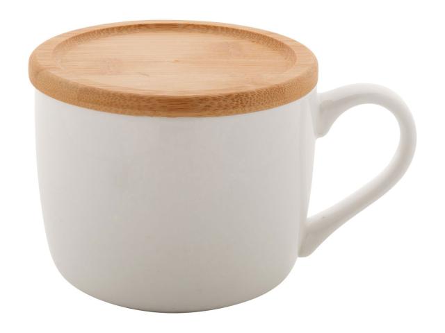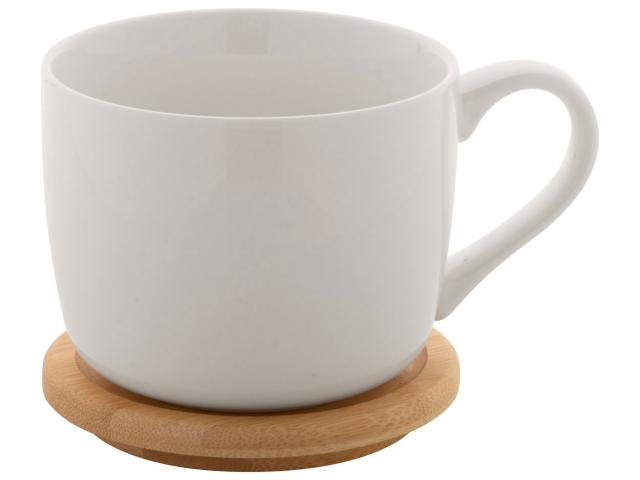 High quality, large sized porcelain mug in white colour with bamboo coaster, 400 ml. In gift box.