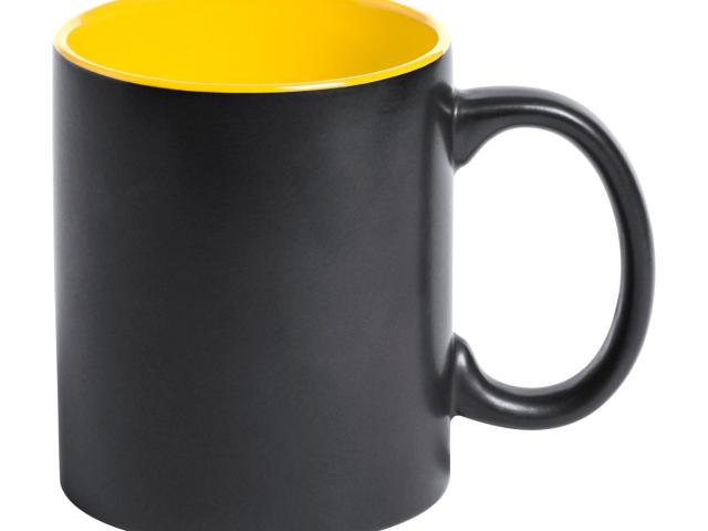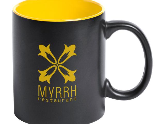 Black ceramic mug with coloured inside, 350 ml. With special coating for engraving, the engraved logo is matching the inside colour. In gift box.