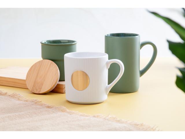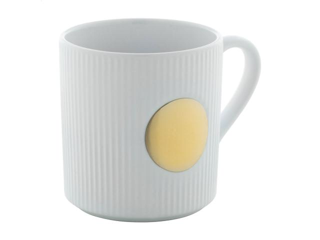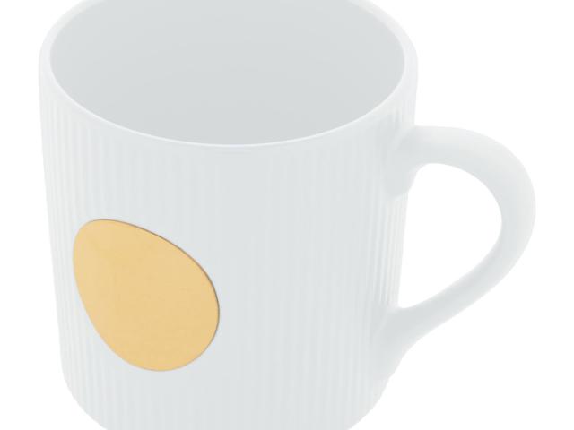 High quality ceramic mug with brass plate for logo engraving. With matte outside and glossy inside finish. 330 ml. In kraft paper box.