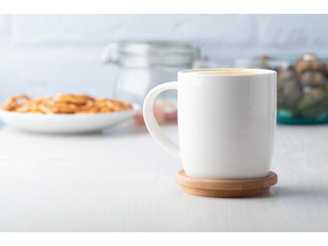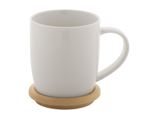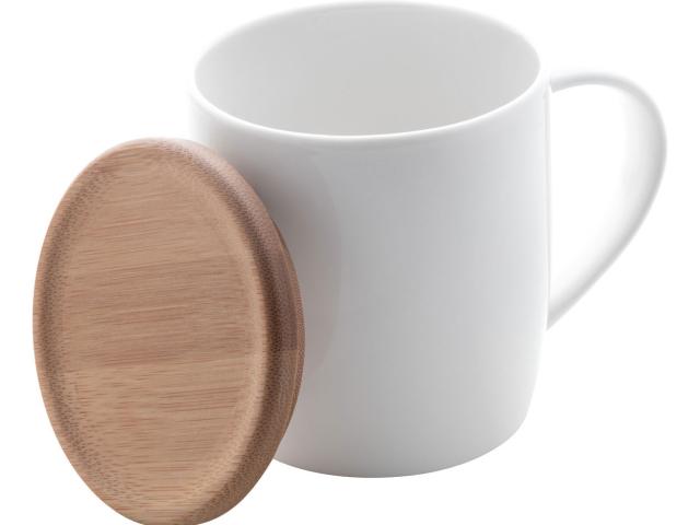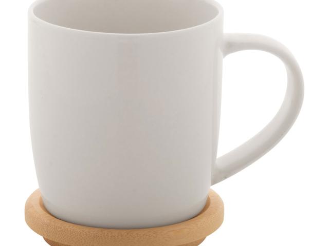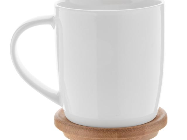 High quality porcelain mug in white colour with bamboo coaster, 320 ml. In gift box.