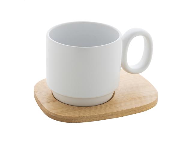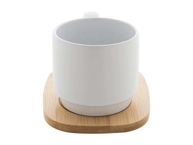 High quality ceramic mug with matte outside and glossy inside finish. Including bamboo serving tray. 220 ml. In kraft paper box.