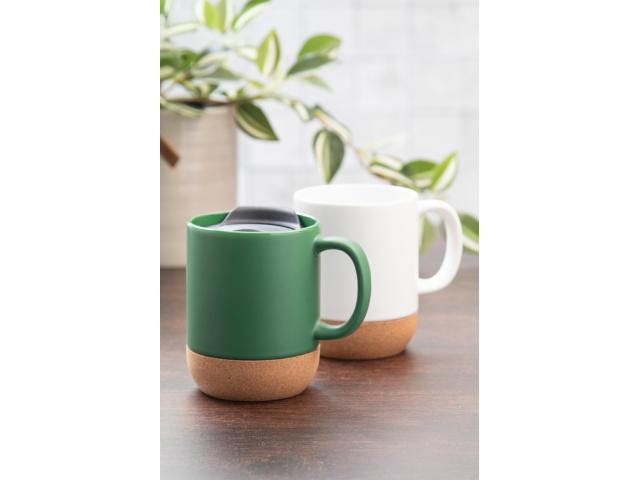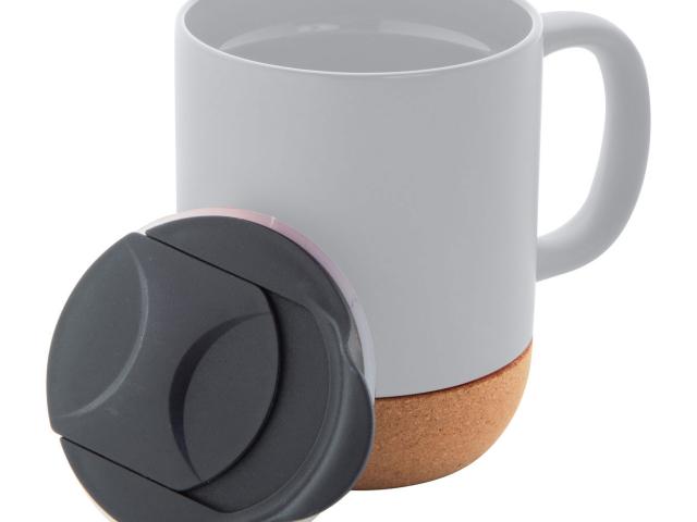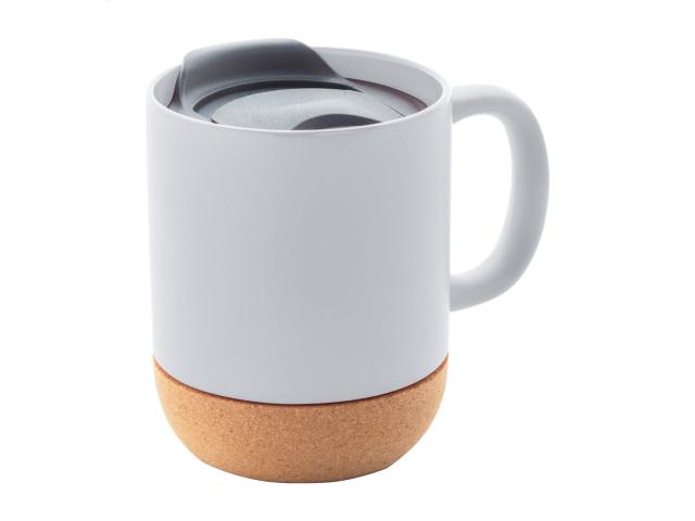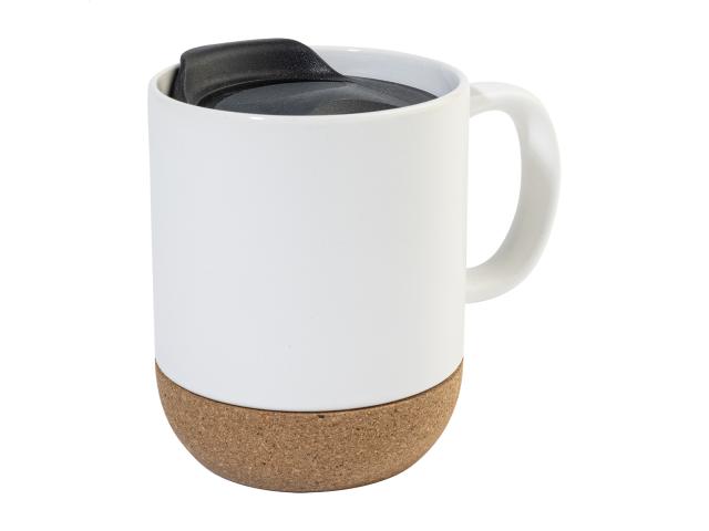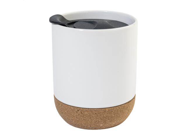 High quality ceramic mug with natural cork base and PP plastic drinking lid. With matte outside and glossy inside finish. 325 ml. In kraft paper box.
