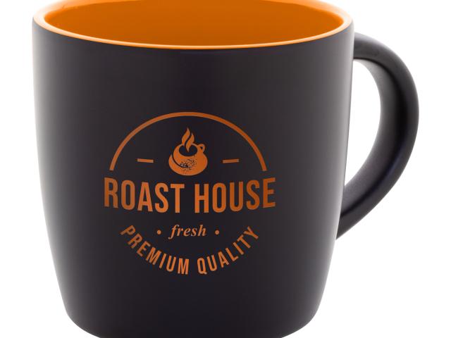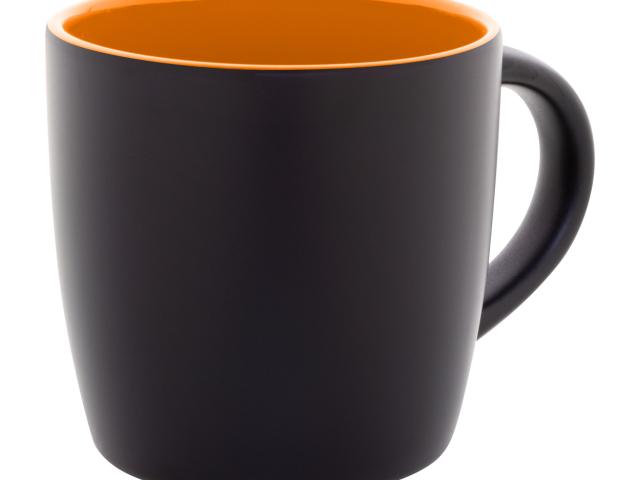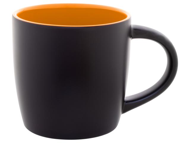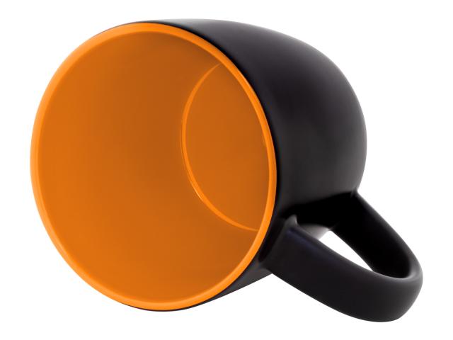 Black ceramic mug with coloured inside, 300 ml. With special coating for engraving, the engraved logo is matching the inside colour. In kraft paper box.