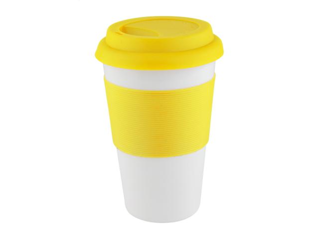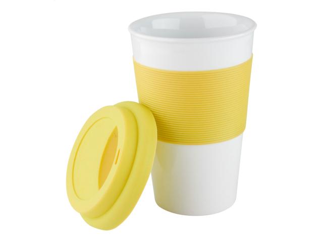 Ceramic mug with silicone drinking lid and grip, 400 ml.