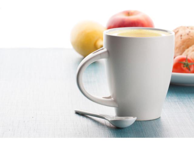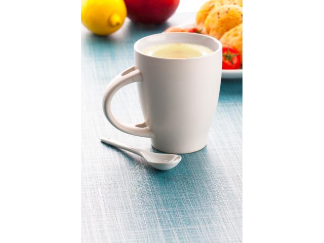 White ceramic mug with coloured inside and matching colour ceramic spoon, 300 ml. With brown gift box.