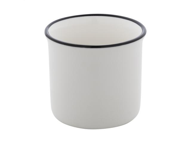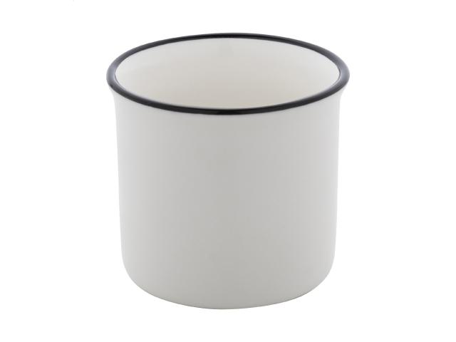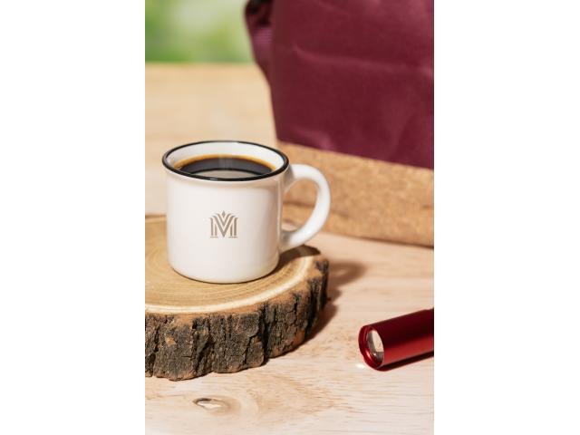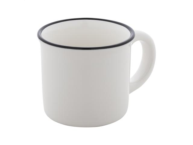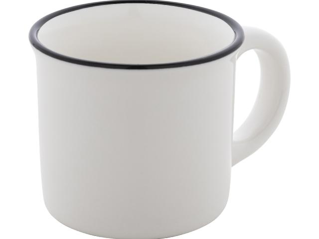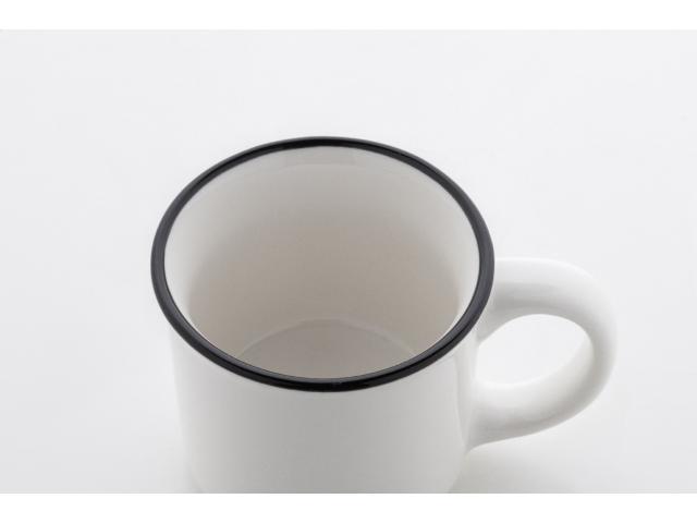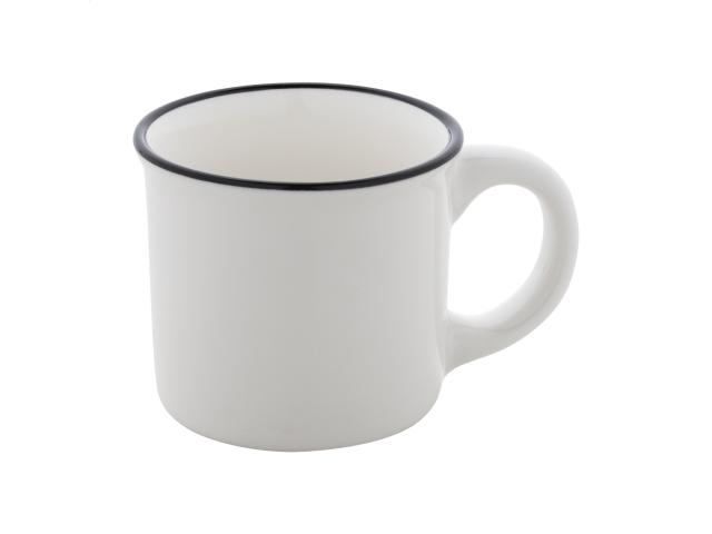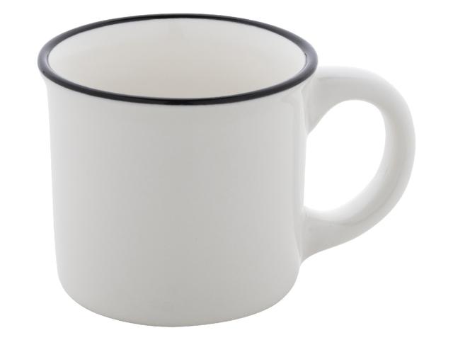 Mini vintage ceramic mug with black rim, white inside and coloured outside, 90 ml. In kraft paper box.