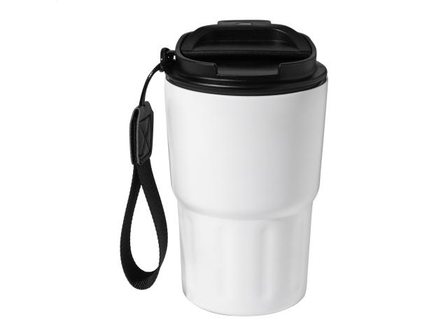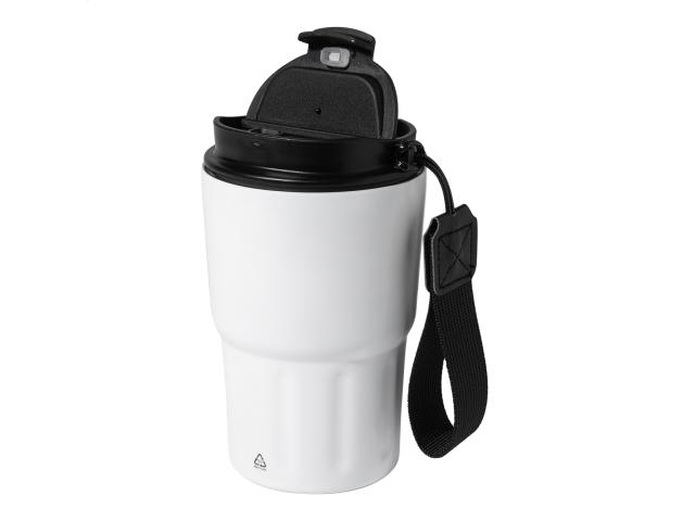 Double-wall, recycled stainless steel insulated thermo cup with PP drinking lid. With RPET polyester carry strap. 350 ml.