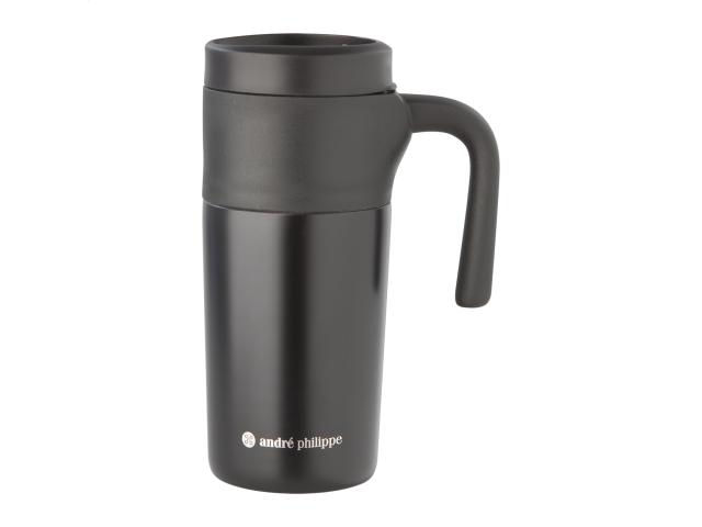 Stainless steel, double-wall thermo mug with plastic drinking lid and handle, 330 ml. Delivered in black carton gift box. André Philippe brand product.