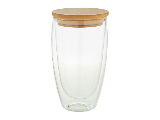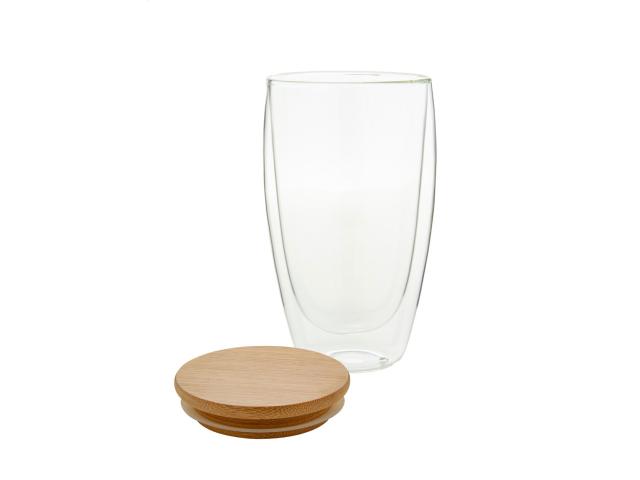 Double-wall borosilicate glass thermo cup with bamboo lid, 420 ml. In kraft paper box.