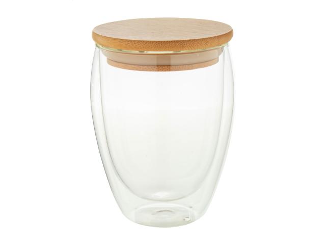 Double-wall borosilicate glass thermo cup with bamboo lid, 320 ml. In kraft paper box.