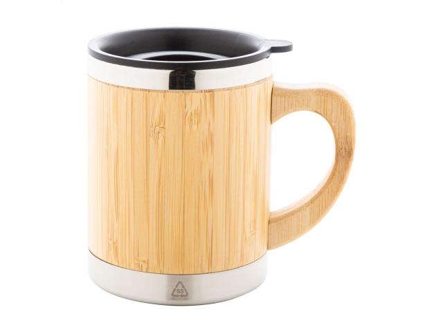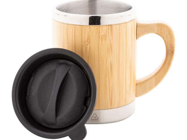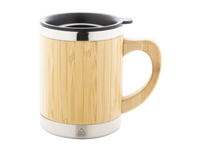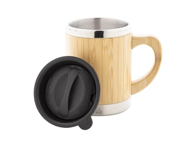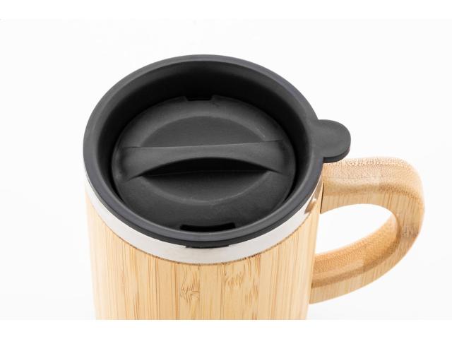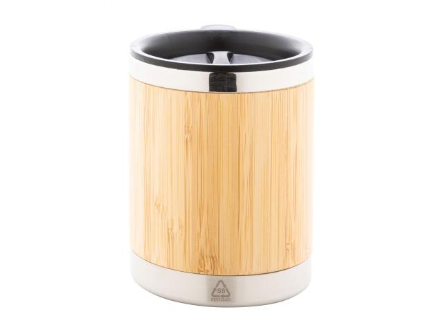 Bamboo covered, double-wall recycled stainless steel insulated thermo mug with bamboo handle and PP drinking lid, 300 ml.