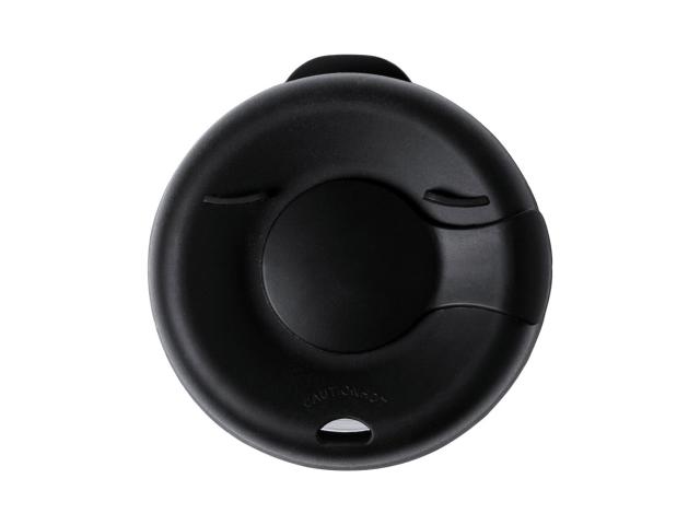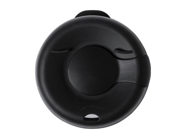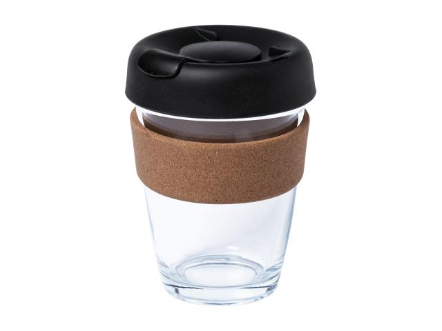 Single-wall borosilicate glass travel cup with natural cork grip and silicone drinking lid, 350 ml.