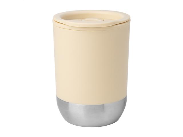 Double-wall, PP plastic insulated thermo cup with recycled stainless steel base and drinking lid. 300 ml.