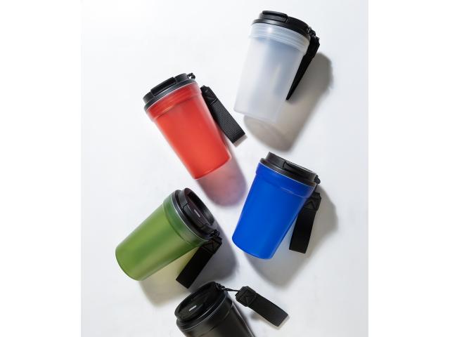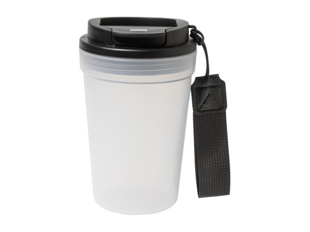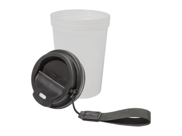 Single-wall, frosted finish PP plastic travel cup with drinking lid and RPET polyester carry strap. 400 ml.
