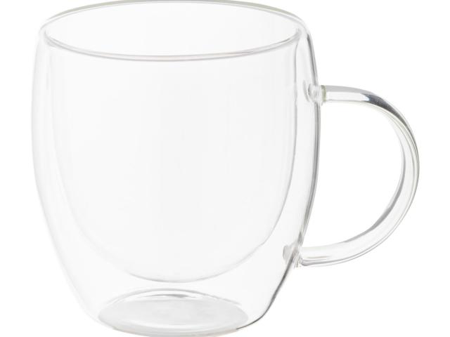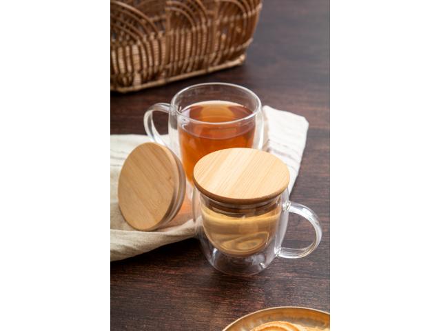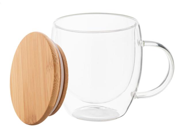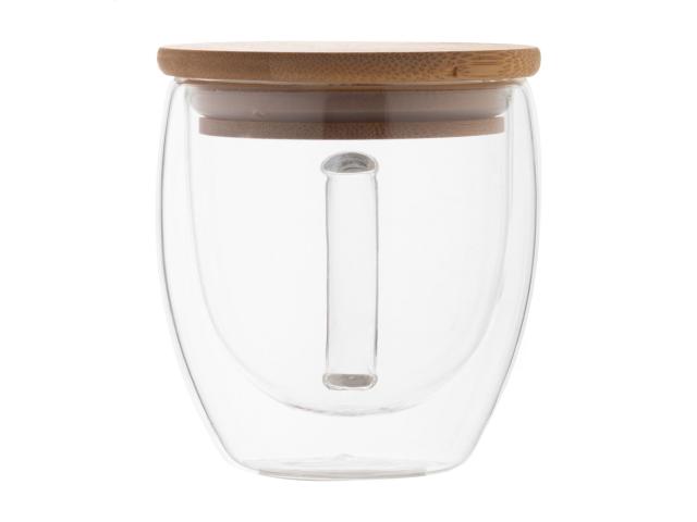 Double-wall borosilicate glass thermo mug with handle and bamboo lid, 250 ml. In kraft paper box.