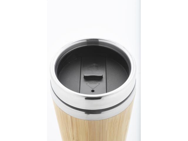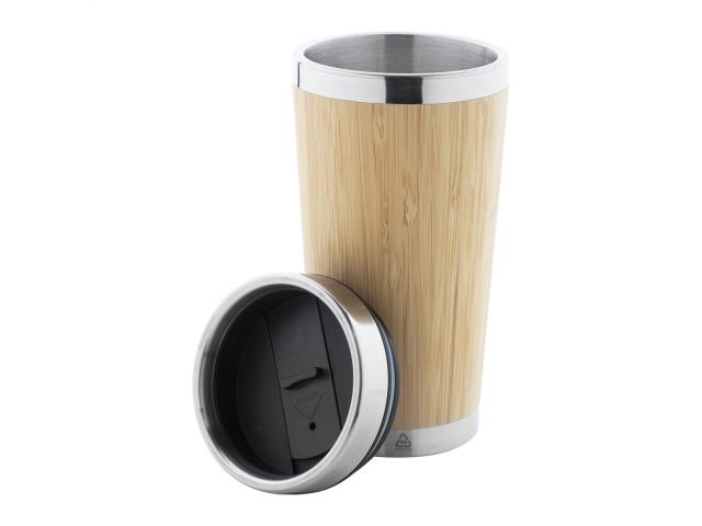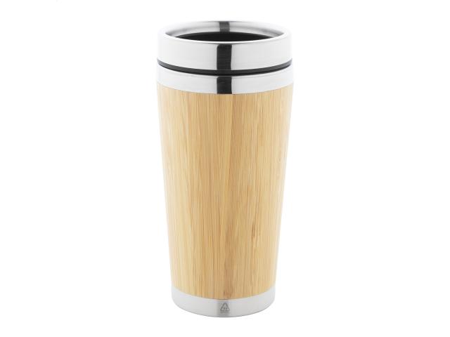 Bamboo covered, double-wall recycled stainless steel insulated thermo cup with PP drinking lid, 500 ml.