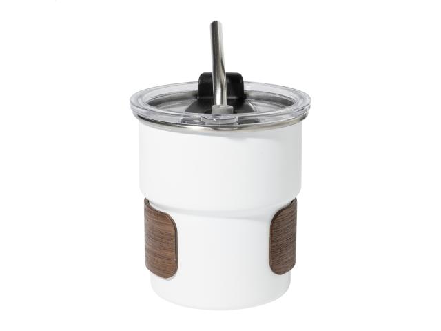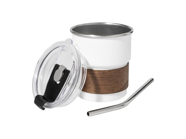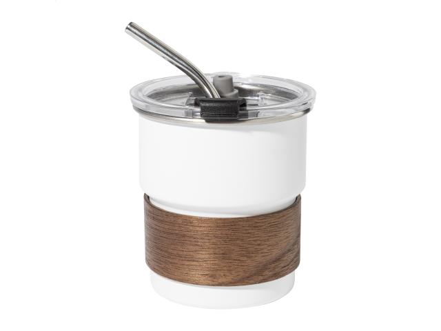 Single-wall, recycled stainless steel travel cup with walnut wood grip, plastic drinking lid and recycled stainless steel straw. 260 ml.