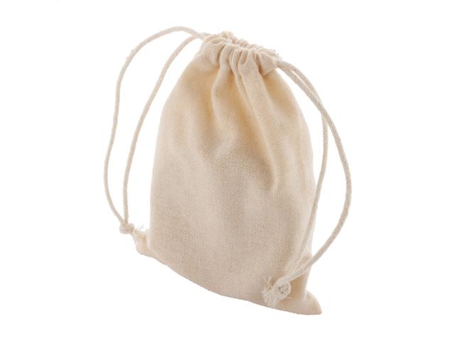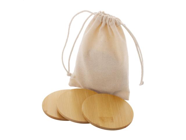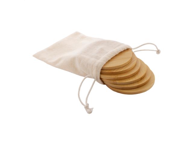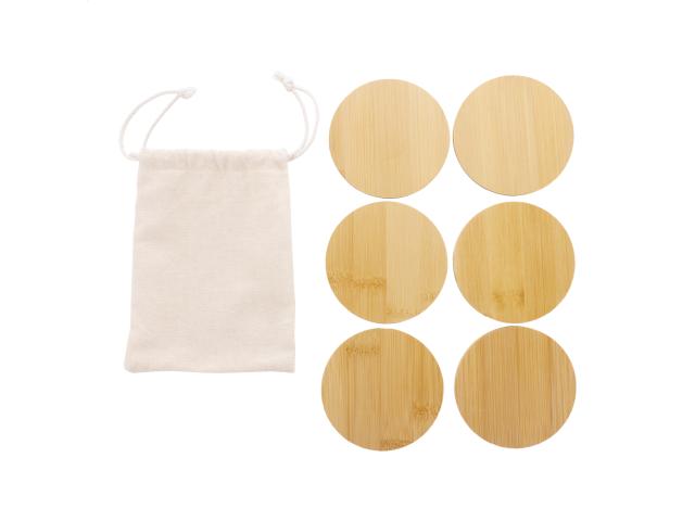 6 pc round bamboo coaster set in cotton drawstring pouch.