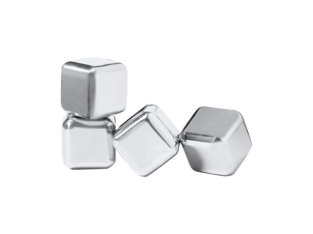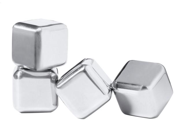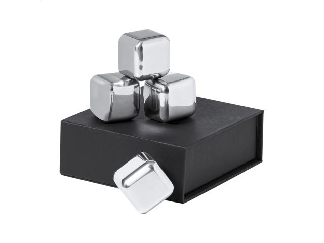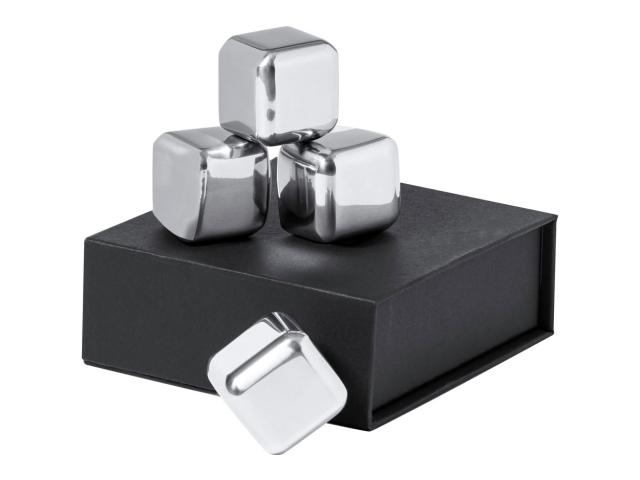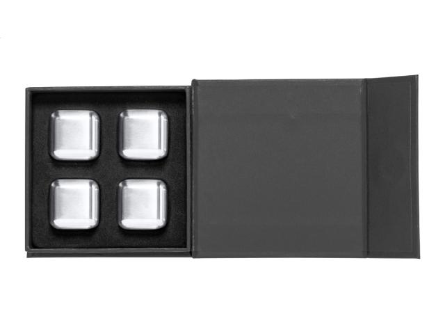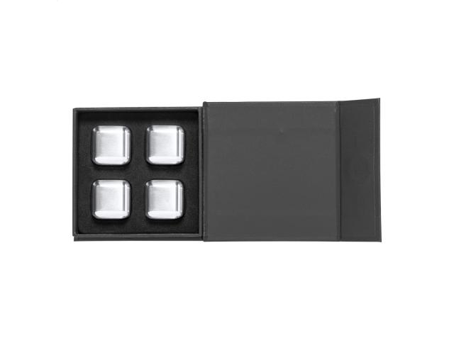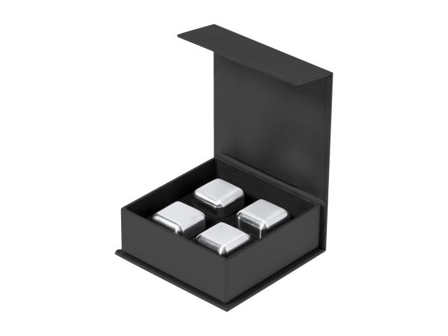 4 pc reusable stainless steel ice cube set in black gift box.