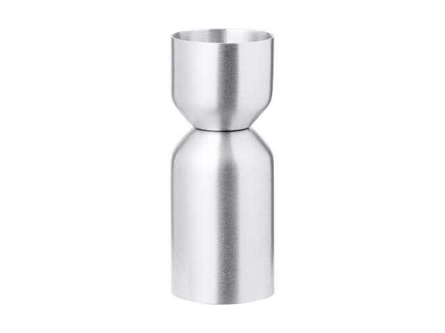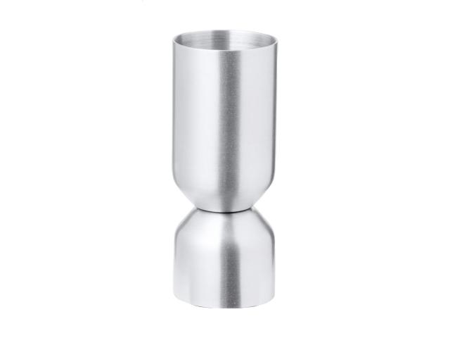 Stainless steel jigger to measure 1 or 1/2 ounce.