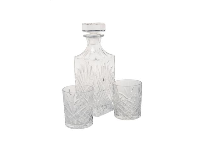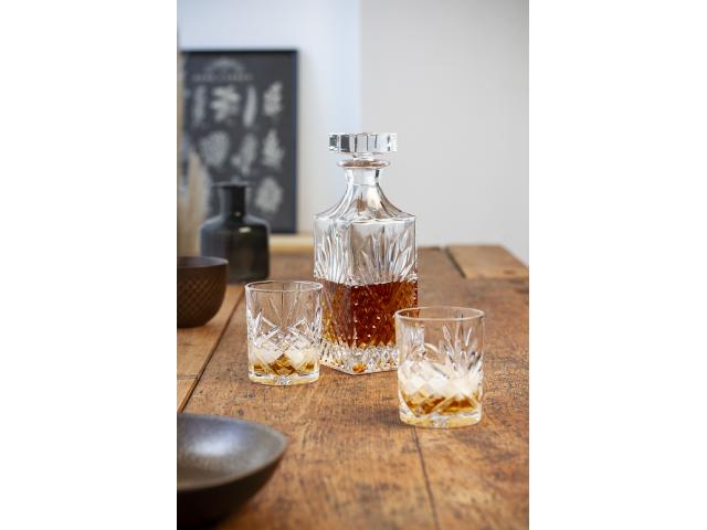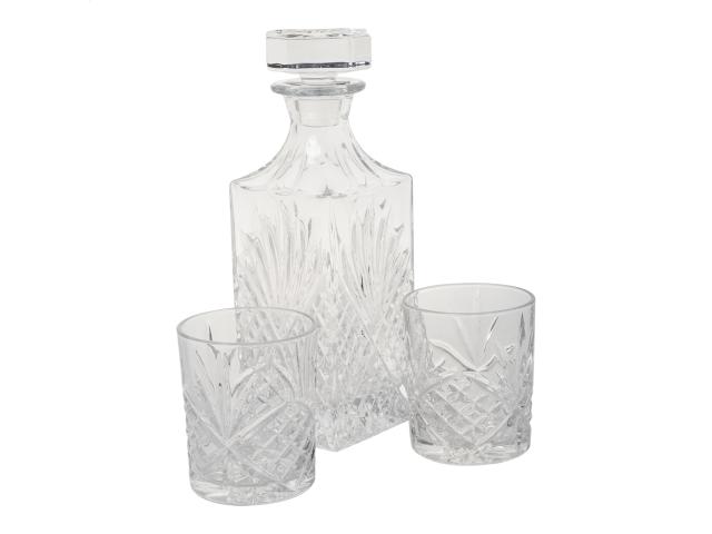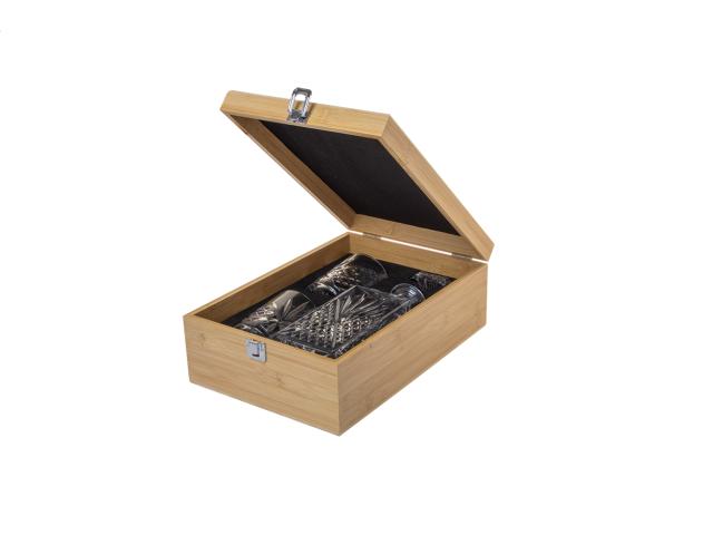 Luxury whisky set in bamboo box with glass decanter bottle (750 ml) and two whisky glasses (280 ml).