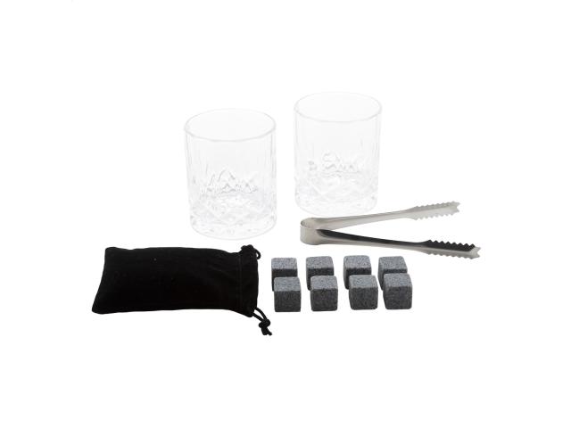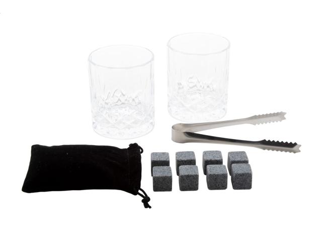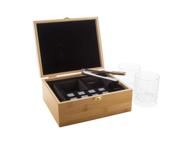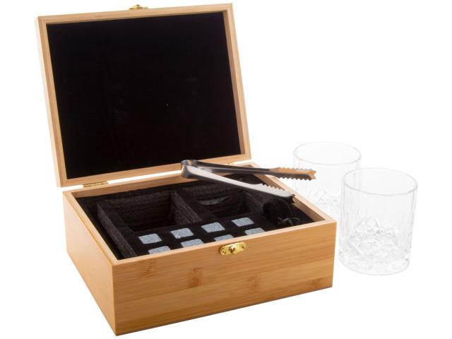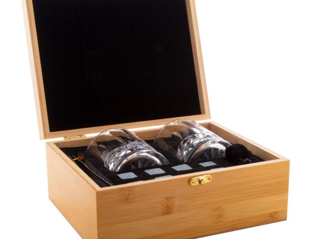 Luxury whisky set in bamboo gift box. Includes 2 whisky glasses (250 ml), 8 reusable stone ice cubes with storage pouch and stainless steel tongs.