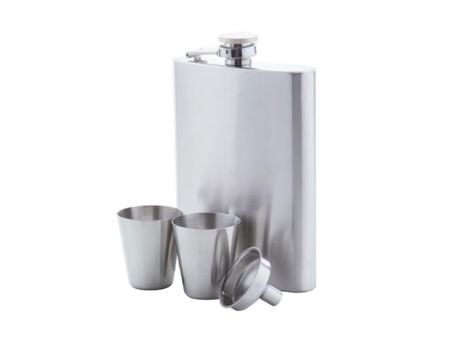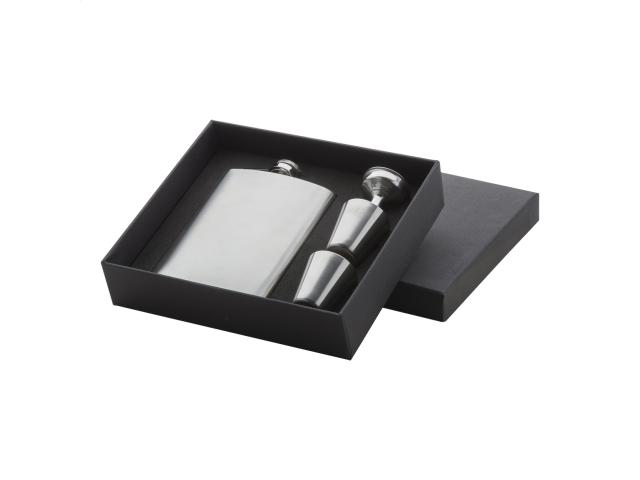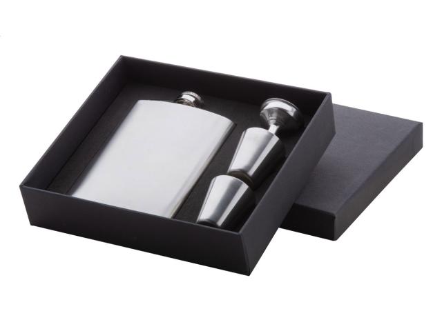 Stainless steel hip flask with 2 shot glasses and a funnel, 230 ml. In black gift box.