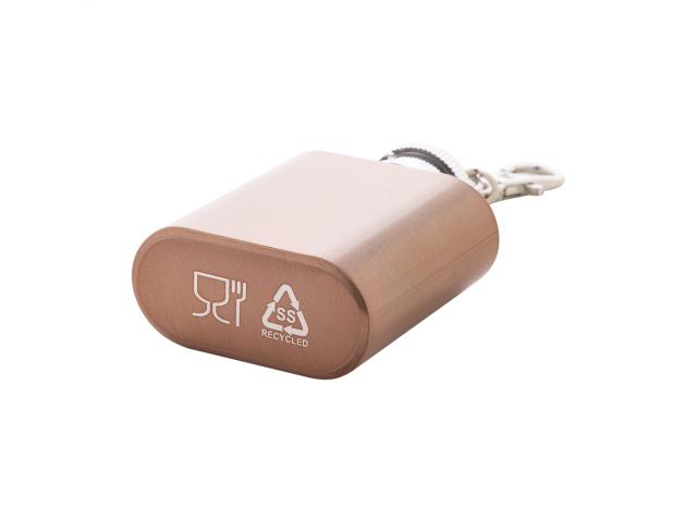 Recycled stainless steel mini hip flask with shiny metallic finish and carabiner keyring. 30 ml.